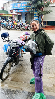 Da die Route sich entlang der steilen Bergseiten, dann wieder durch unberührte Bergbauerndörfer und vorbei an riesigen Reisterrassen schlängelt, wird sie von manchen auch zu den schönsten Motorradstrecken der Welt gezählt. Das wollten wir uns auf keinen Fall entgehen lassen. Hier war es üblich sich einen sogenannten "Easy Rider" zu nehmen. Das war ein (hoffentlich) erfahrener einheimischer Biker, zu dem man sich hinten aufs Moped setzte und die Fahrt und Aussicht für die nächsten Tage genoss. So hatten alle Ha Giang Loop Touristen, egal ob sie selbst fahren konnten oder nicht, die Möglichkeit, dieses Abenteuer zu bestreiten. Aber ich hatte natürlich den großen Vorteil, einen tollen, eigenen äußerst erfahrenen (sexy) Easy Rider aus Österreich mitgebracht zu haben, an den ich mich während der nächsten 3 Tage kuscheln konnte. Nach dem abwiegen, ob wir alleine oder mit einer Gruppe fahren wollten (die Tourorganisatoren stellen die Karte zu Verfügung, sowie einen WhatsApp Service und organisieren die Unterkünfte), entschieden wir uns für ein Zweirad-Abenteuer in der Gruppe. So mussten wir uns um nichts kümmern und fuhren einfach brav in der Reihe mit und konnten die beeindruckenden Bilder und Ausblicke die sich uns boten, in Gedanken verarbeiten. Zumindest ich. Chris war ja mit Fahren beschäftigt. Aber immerhin musste er sich nicht mit der Route auseinander setzen und ich hatte frei und musste nicht mit Google Maps in der Hand die Route kontrollieren und meinem Vordermann ansagen. Der Abfahrtstag war regnerisch und kalt. Wir tauschten unsere sommerlichen Weltenbummlerklamotten gegen unser einziges Kälteoutfit, streiften unsere Regenjacke und Poncho über und bekamen noch Regenschutz für Beine und Schuhe von unseren Tourbegleitern. Das Touren Gepäck wurde ebenfalls regensicher in Plastikbeutel verpackt und ganz fest hinten auf das Gefährt gezurrt. Ich wurde dann wie in einem Babysitz zwischen Chris und dem Gepäck eingeklemmt und hatte somit einen perfekten bequemen Sitz inklusive Rückenlehne.