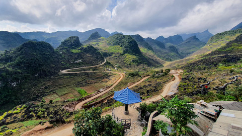 Die nächsten 3 Tage fuhren wir von morgens bis kurz vor Sonnenuntergang durch die imposanteste Landschaft, die wir im Laufe unserer Weltreise gesehen hatten. Der Ha Giang Loop ist definitiv ein- oder das Highlight unserer Vietnamreise. Es waren einfach 3 Tage die vollgepackt an Eindrücken waren. Man hat ständig etwas zu tun. Erst dachten wir, dass die Entscheidung mit einer Gruppe zu fahren, vielleicht doch falsch gewesen war, da wir eine äußert große Motorrad Kolonne bildeten und anfangs nur eher langsam vorankamen. Aber bald erkannten wir, das tatsächlich der Weg das Ziel ist und man bei hohem Tempo ohnehin nichts mitbekommt von der grandiosen Umgebung in der man sich aufhalten darf. Spätestens am ersten Abend, als wir in einer typischen urigen Unterkunft untergebracht wurden und uns traditionelles vietnamesisches Abendmahl aufgetischt wurde, war uns klar, dass es in Gesellschaft noch viel lustiger sein konnte. Unsere insgesamt 8 Tourenbegleiter, allesamt junge lustige Vietnamesen, machten uns mit dem obligatorischen hochprozentigen "Happy Water" mehr vertraut als uns lieb war und die traditionelle asiatische Karaoke Session durfte natürlich auch nicht fehlen.