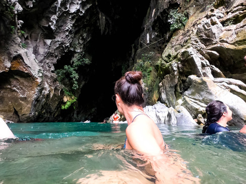 Wir marschierten den Fluss aufwärts bis wir zu einer Stelle gelangten, an der der Fluss direkt aus einer großen Grotte aus dem Berg herausströmte. Wir wurden eingeladen, hier, an den uns zuvor erklärten Stellen, schwimmen zu dürfen. Das Wasser war etwas frisch, aber ich finde, dass man für niedrige Wassertemperaturen in Relation zur Schönheit der Umgebung, unempfindlicher wird. Die Strömung war ganz schön stark, aber hatte man den richtigen Weg rausgefunden, konnten wir als Gruppe in die Grotte hineinschwimmen und auf die im Fluss liegenden Felsen hinaufklettern. Manche wagten sich bis ganz weit hinein, wo das Tageslicht nicht mehr hinlangte. Es stellte sich heraus, dass dies keine Grotte war, sondern bereits der Ausgang der von uns demnächst zu erkundenen Höhle. Aber zuvor gab es nach dem Schwimmspass noch ein gemeinschaftliches vietnamesiches Mittagsessen. Es hatten uns rund 8 Träger begleitet, die die Höhlenausrüstungen, Schwimmwesten, Wasser und Verpflegung für uns mitgetragen hatten. Als wir vom Schwimmen an unser Lager zurückkehrten, hatten sie den Boden mit einer Plane und Bananenblättern ausgelegt, die als Teller und Anrichteplatten dienten. Drauf war allerhand leckeres Essen wie an einer langen Tafel angerichtet. Wir setzten uns also alle im Schneidersitz um unsere Bananenblatt Tafel und lernten uns bei Speis und Trank zum ersten Mal etwas näher kennen. Wir lernten dabei ein sehr nettes kanadisches Pärchen kennen, die wir dann auch in der nächsten Stadt bald nochmal zufällig trafen.